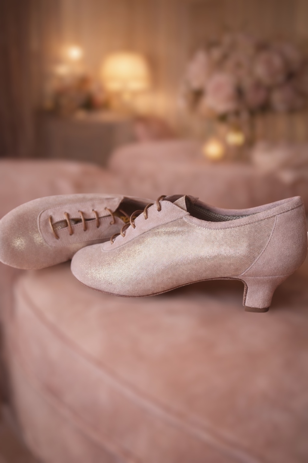 The design blends a soft matte dusty-pink suede with a subtle shimmering dusty-pink suede, creating a delicate play of light and texture that enhances every movement.
